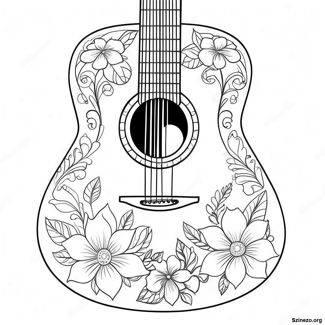 Töltse le a nyomtatható PDF verzióját a(z) Akusztikus Gitár Virágokkal Színezőlap oldalnak