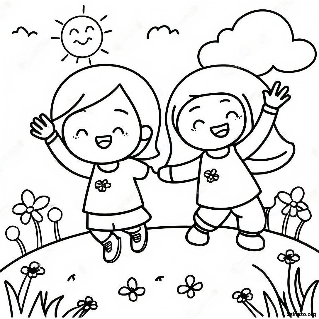 Töltse le a nyomtatható PDF verzióját a(z) Boldog Gyerekek Játszanak Tavasszal Színezőlap oldalnak