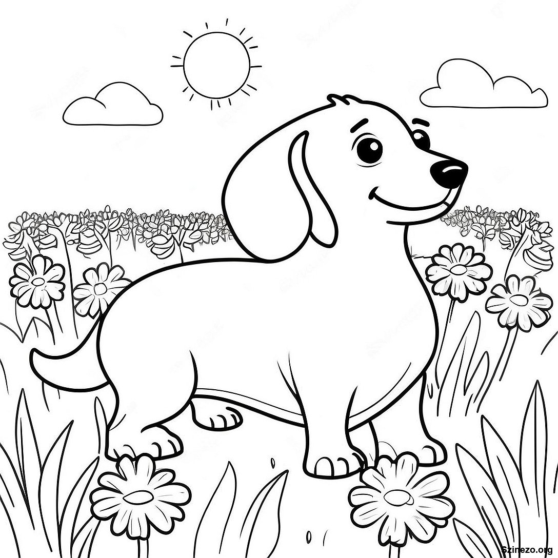 Hosszú Szőrű Dachshund Virágmezőn Színező Oldal