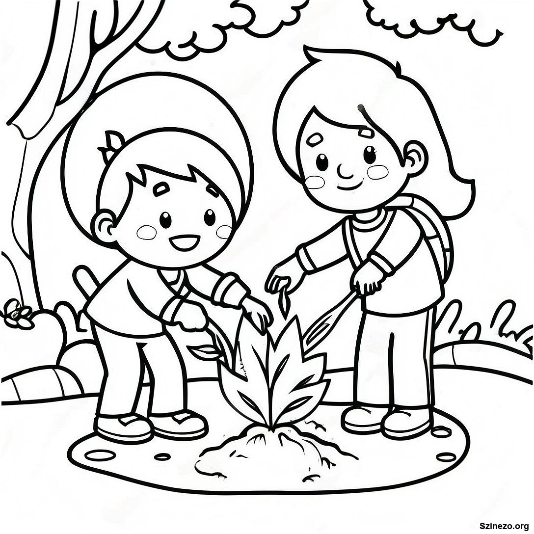 Játékos Gyerekek Fát Ültetnek Színezőlap