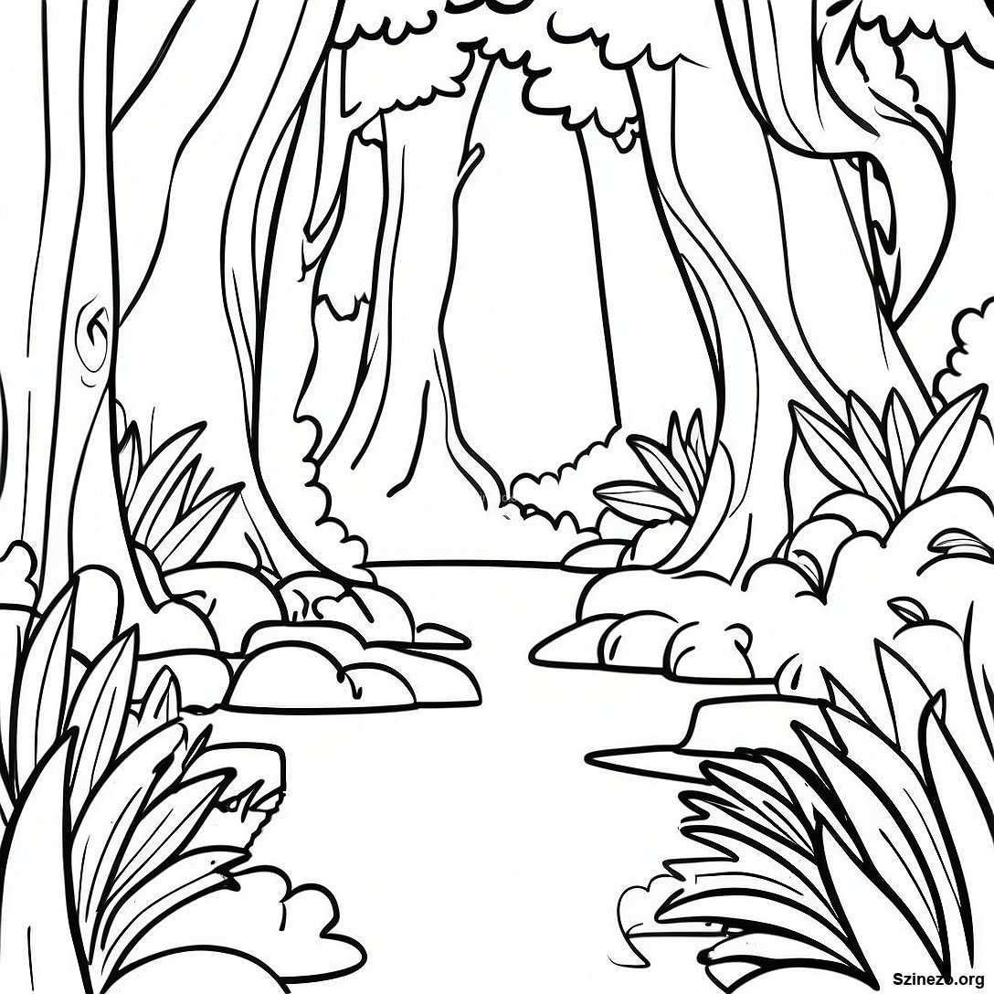 Töltse le a nyomtatható PDF verzióját a(z) Sűrű Zöld Erdő Jelenet Színezőlap oldalnak